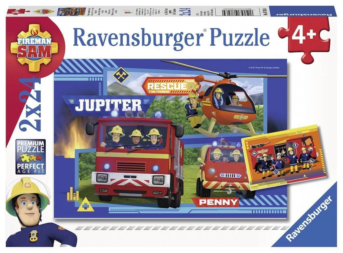2 kinderpuzzels van 24 stukjes met afbeeldingen van Brandweerman Sam in actie .