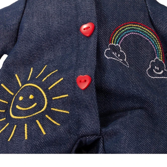 Little Muffin is in een goed humeur vandaag, want ‘s middags is er een zomerfeest. Ze draagt haar comfy jeans overall met zon- en regenboogstiksels en hartjesknoopjes als versiering. Voeg gewoon je zomersandalen en chique haarclip toe en veel plezier!
