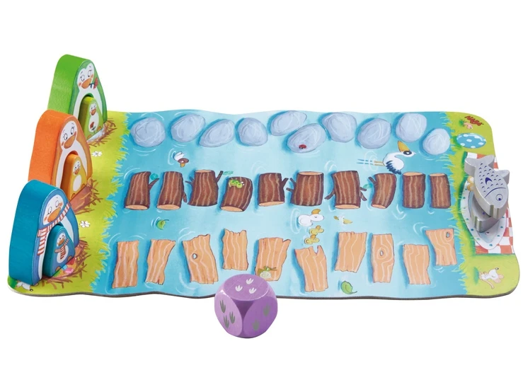 De pinguïnmama’s wonen met hun baby’s op een eiland. Maar lekkere vis vind je alleen op het vasteland, en de pinguïnbaby’s kunnen nog niet zwemmen. Gelukkig steken genoeg stenen, boomstammen en planken uit het water zodat de pinguïnbaby’s samen met hun mama’s naar de overkant kunnen huppen. Wie loopt het snelst met zijn pinguïnpaar naar het vasteland en mag daar heerlijk smullen van twee lekkere vissen?