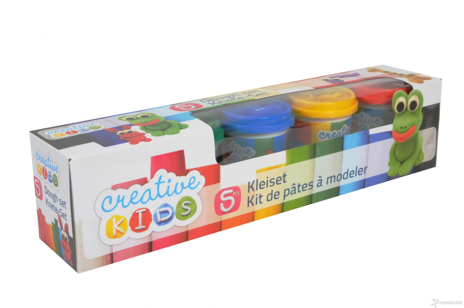 Set van 5 kleuren klei. 140 g. per potje. De dekseltjes van de pot zijn voorzien van vormpjes.