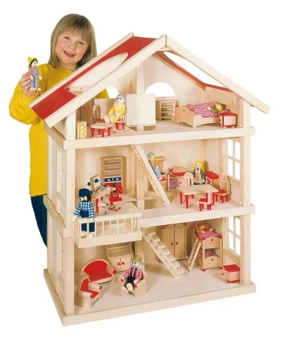 Een groot houten poppenhuis met 3 etages en balkon. Excl. accessoires.Geschikt voor poppetjes met een lengte van max. 12 cm.
