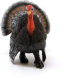 Kalkoenen zijn een fazantensoort en komen oorspronkelijk uit Noord-Amerika. De mannelijke dieren hebben zwarte en een handvol metallic glimmende bonte veren. Dedonkerrode en lichtblauwe nek en kop zijn kaal. Als de hanen in de paartijd met elkaar om de hennen concurreren, spreiden ze hun staartveren uit als waaiers. Net als de kalkoen van Schleich® Farm World.