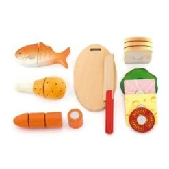 Een leuke 17-delige houten snijset waarvan de diverse delen met klitteband zijn verbonden. Het geheel wordt geleverd in een houten kistje met deksel.