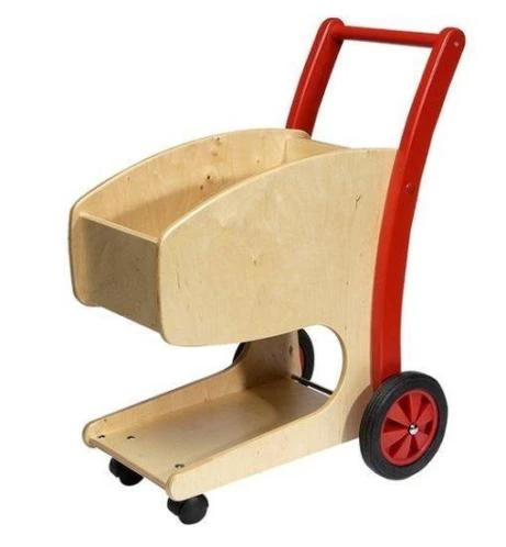 Zeer degelijke winkelwagen gemaakt van berken multiplex en massief beukenhout (duwstang). De voorwielen zijn zwenkwielen. De bak is ongelakt en duwhoogte v.d. winkelwagen is 60 cm.